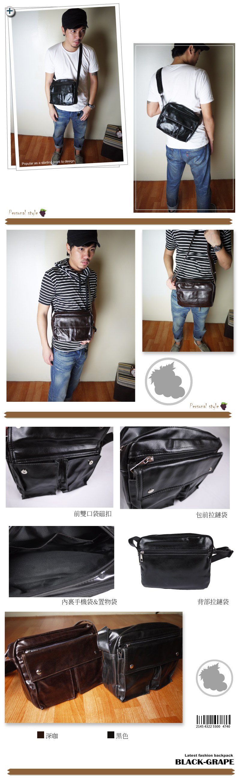 優質亮面油皮/雙口袋磁扣/亮面金屬拉鏈/包一共四層拉鏈袋/流行必搭款,怎樣背都能有型 輕鬆簡單就能有型。店面價:880元 網路黑葡萄價格:470元 |